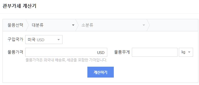 - 물품 종류 선택 : 계산기에서 물품의 종류를 선택합니다. 의류, 전자제품 등 다양한 카테고리가 있습니다.