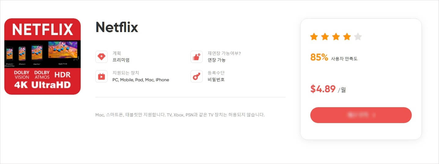 - 프리미엄 요금제: 17,000원/월 – 4K 화질, 네 개 화면 동시 스트리밍