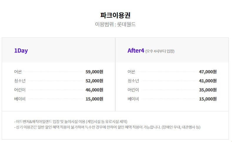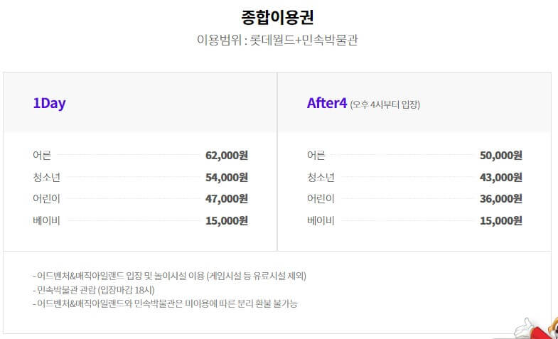 종합 이용권과 파크 이용권은 약 3,000원 정도의 가격 차이가 있으며, 가족 단위로 롯데월드를 방문하지 않으신 분들은 종합 이용권을 추천해 드리며, 친구와 연인의 데이트라면 파크 이용권으로도 충분할 것 같습니다.