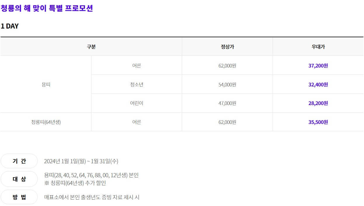 방법 : 매표소에서 생년월일 증명 제시(신분증 등)