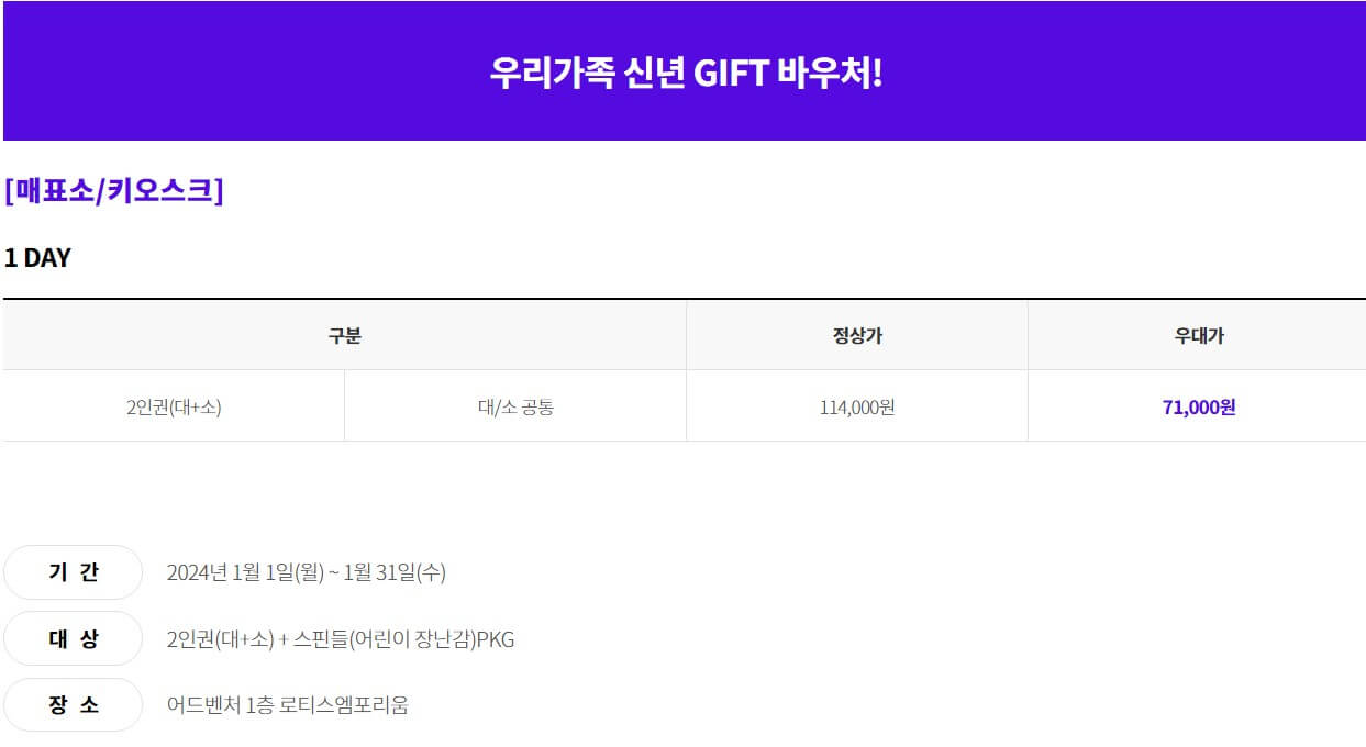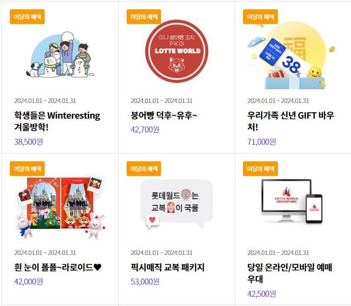 4종류의 할인혜택에 대해서 살펴보았습니다. 1월은 용띠이신 분들을 행사 외에도 겨울철 학생할인 우리 가족 GIFT행사등 연초에 걸맞은 다양하고 파격적인 행사들이 많으니 꼭 알아보시고, 할인 많이 받으시고 즐거운 롯데월드 되시길 바랍니다.