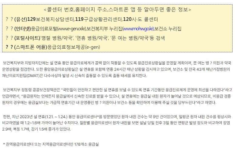 보건복지부 누리집에서 명절 의원, 약국에 대한 정보와 응급대처법에 대해서 공개했습니다. 자세한 내용은 아래에서 확인하실 수 있습니다.