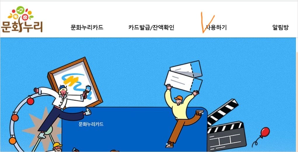 1. 문화누리 홈페이지 접속 상단의 사용하기 클릭합니다.