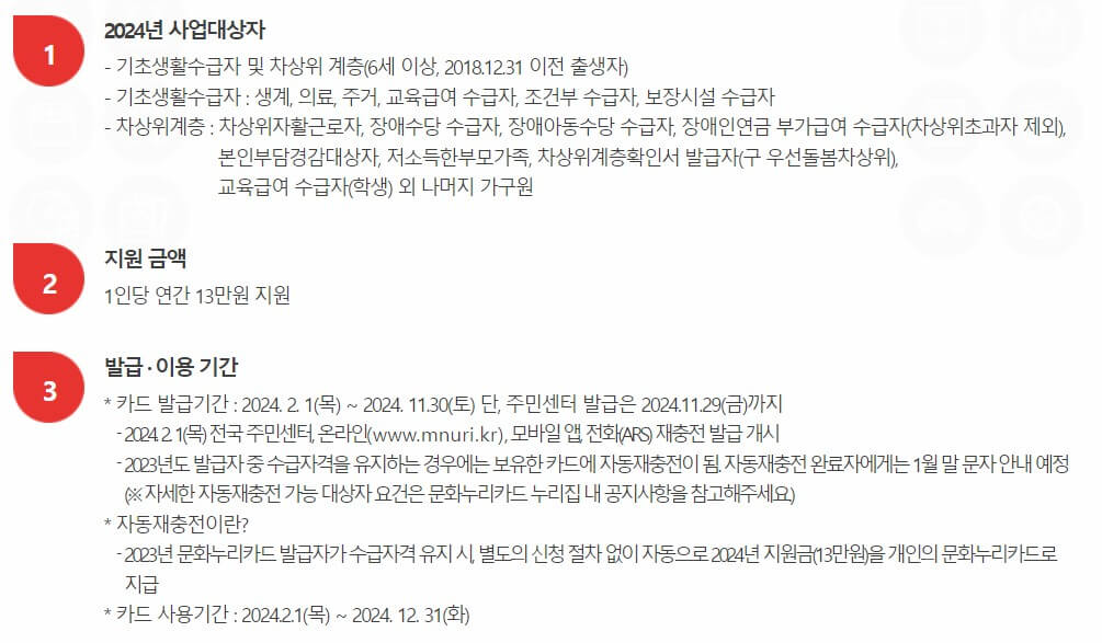 문화누리카드는 기초생활수급자, 차상위계층을 대상으로 24년도 1인당 연간 13만 원 한도의 금액을 전국 문화예술, 관광/체육 관련 가맹점에서 이용할 수도록 도와주는 공익사업입니다. 또한 많