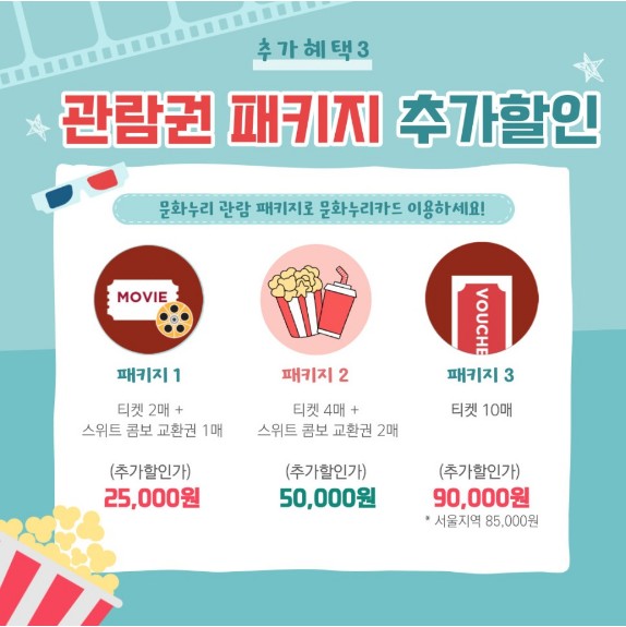 기존에도 있던 패키지 할인에 2천 원 더 추가할인이 되니 영화 보면서 팝콘 음료 좋아하시던 분들에게는 기쁜 소식 아닐까요!