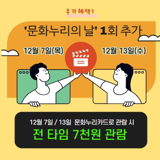 롯데시네마에서는 문화누리의 날이 월 1회 해당일에 전타임 7천 원 관람하던 이벤트를 12월 한 달 동안 2번으로 늘려 12월 7일과 13일 전타임 7천 원에 관람할 수 있게 되었습니다.