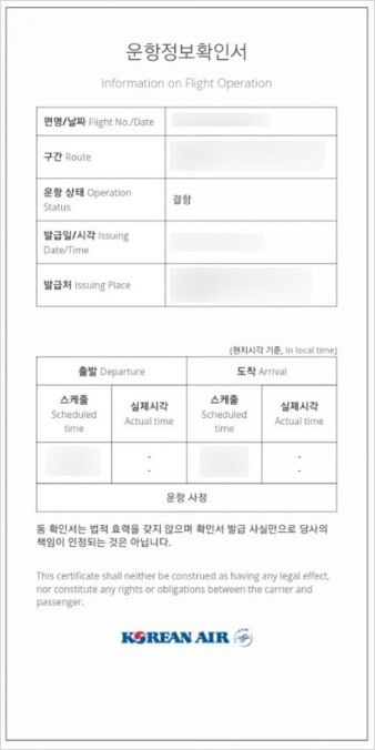 항공편에 따른 결항확인서는 항공편에 따른 결항확인서로 예약자의 이름이 들어간 확인서가 필요하다면 각 항공사의 고객센터 문의하여 이용하셔야 합니다.