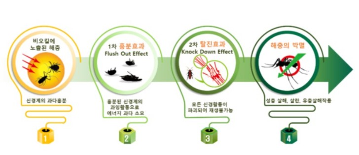 비오틸에 노출된 빈대는 신경계가 과다 흥분되어 과잉활동을 시켜 에너지가 다량 소모를 유도, 탈진상태가 되어 모든 신경활동이 파괴되어 박멸시키는 신경과다 흥분 > 탈진 > 박멸로 이어지는 구조입니다.