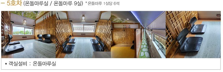 - 5호차 : 온돌마루실 9실 (각실당 최소 3명 최대 6명 수용) 족욕실