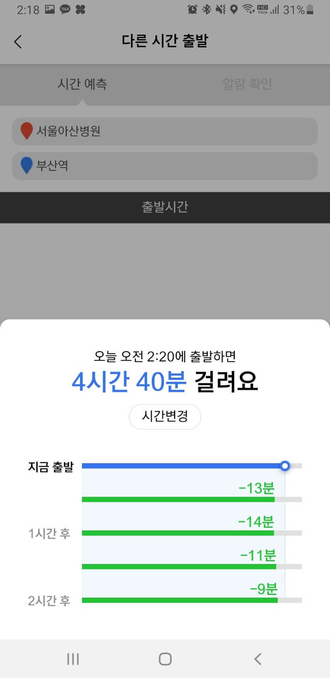 이 중 '다른 시간 출발'이라는 기능을 이용하면, 도착시간을 더욱 효과적으로 계획하실 수 있습니다. 이 기능은 현재 시간이 아닌 사용자가 설정한 다른 시간에 출발했을 경우의 예상 도착시간을 계산해 주는 기능입니다. 이를 통해 교통 체증이 예상되는 시간을 피해 이동하실 수 있습니다.
