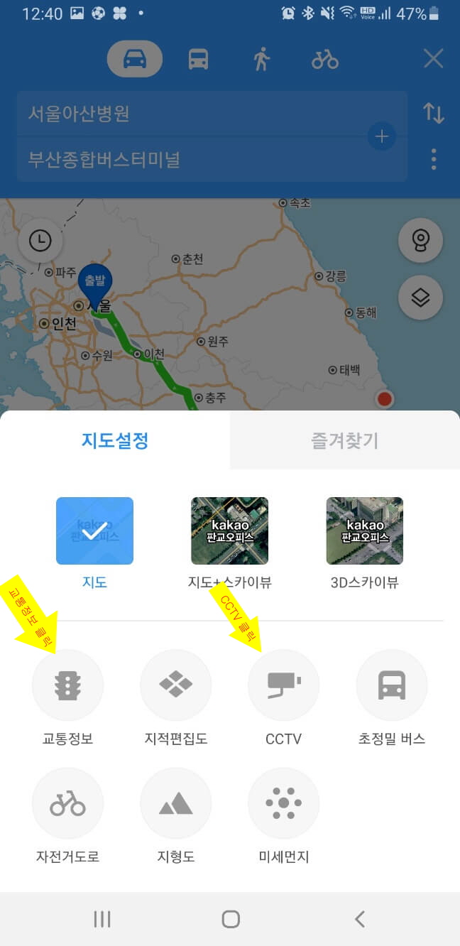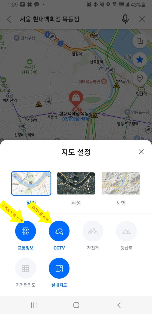 2. 이후 하단에 지도설정 메뉴가 나타나면 교통상황과 CCTV를 선택합니다.