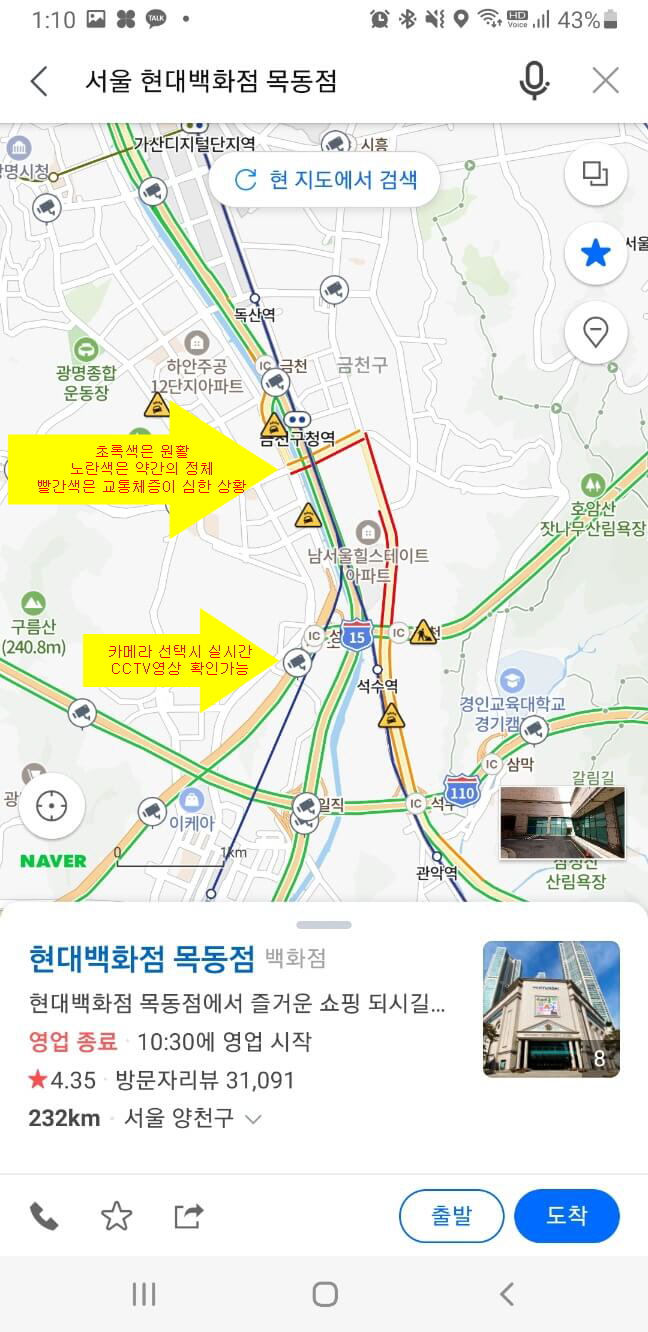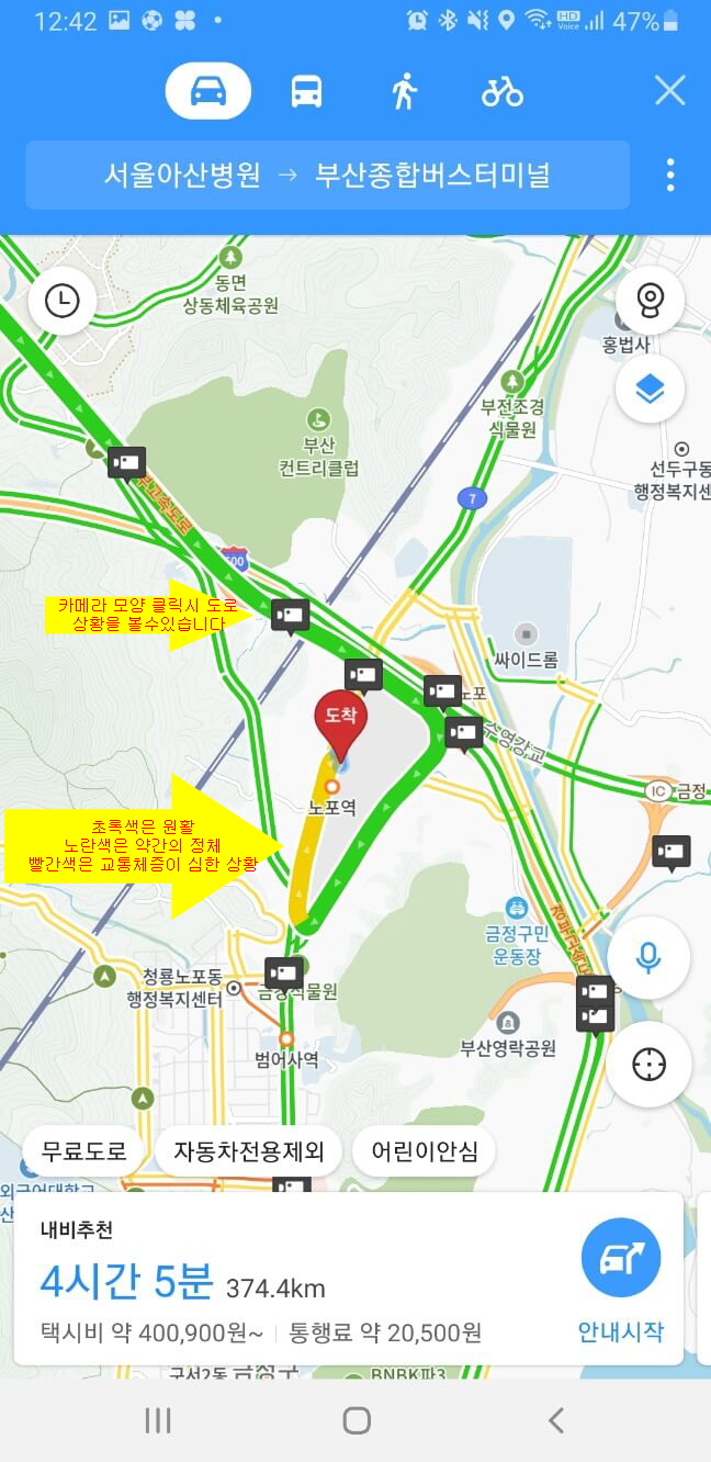 3. 아래와 같이 지도에 있는 도로에 카메라 모양의 아이콘과 초록색-노란색-빨간색으로 표시가 됩니다. 초록색은 원활한 구간, 노란색은 약간의 정체 빨간색은 교통체증이 심한 구간을 나타냅니다.
