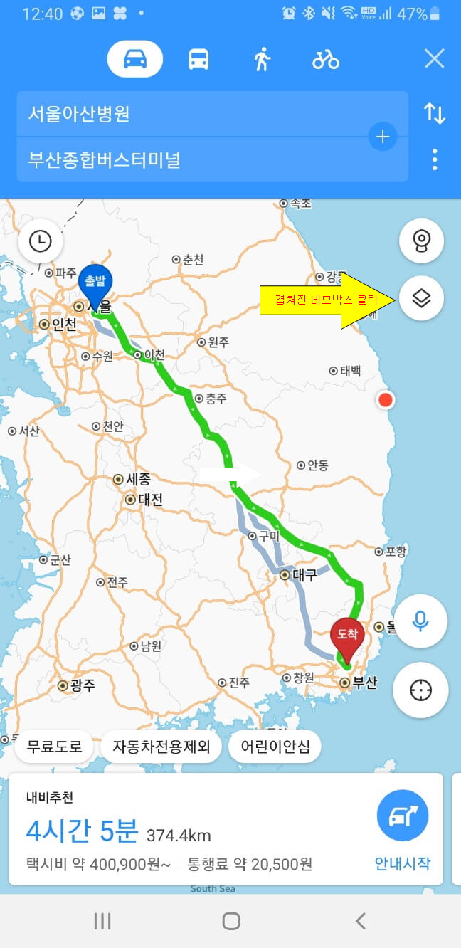 네이버지도도 실시간 교통 정보와 CCTV 확인이 가능한 유용한 앱입니다. 화면의 우측 중앙부 상단에 위치한 겹쳐진 네모 버튼을 클릭하면 해당 기능을 사용하실 수 있습니다. 아래의 간단한 3단계를 차례로 따라 하시면, 나이와 성별에 상관없이 누구나 쉽게 이용하실 수 있습니다.