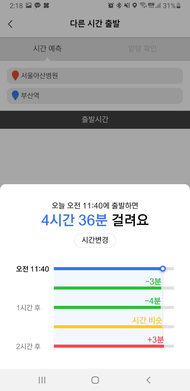 3. 출발지와 도착지를 선택하면 아래와 같이 출발 시간이 나옵니다. 여기서 시간대를 선택하면 도착 시간이 나오며, 다른 시간대 일경우와 비교하실 수 있습니다.