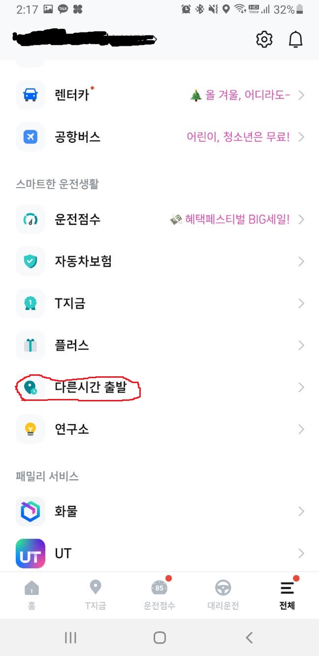 2. 아래로 화면을 내리면 스마트한 운전생활 부분에서 다른 시간 출발 메뉴를 선택합니다.