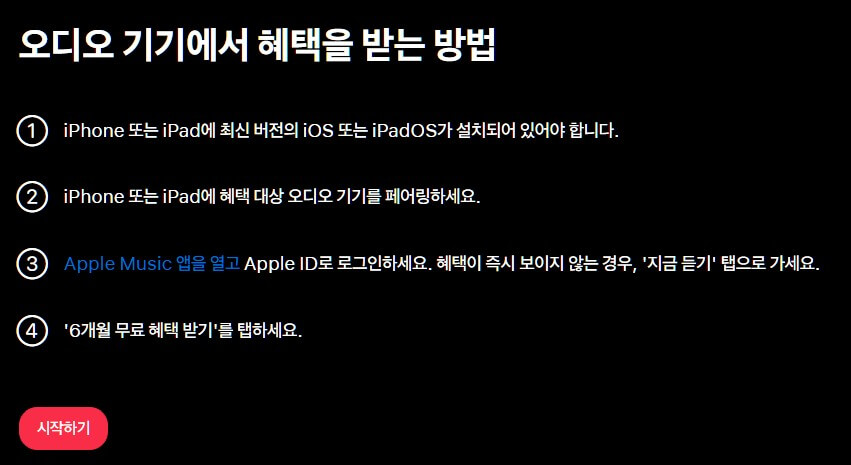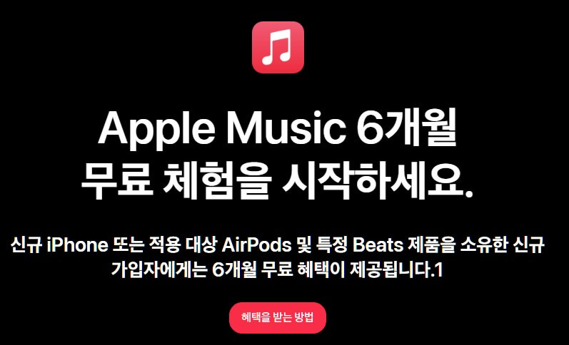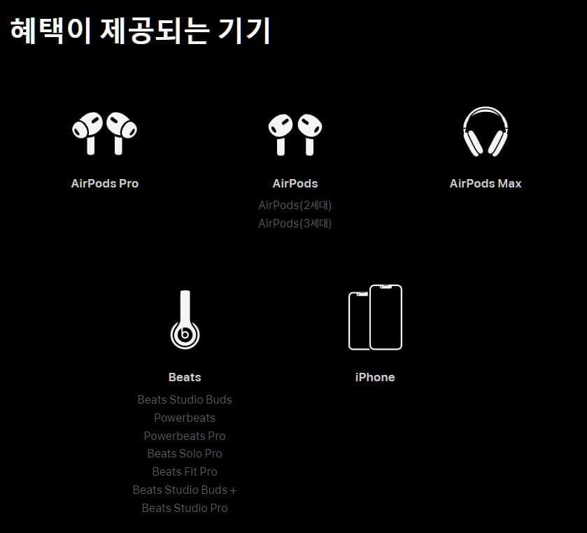 Apple의 오디오 기기인 AirPods 시리즈들을 새로 구입하거나 중고제품을 사용하셔도 6개월 무료이용권을 이용할수 있습니다.. 애플 뮤직 무료체험 6개월이 적용될 수 있는 기기는 AirPods Pro, AirPods (2세대, 3세대), AirPods Max, Beats Fit Pro, Beats Studio Buds, Powerbeats, Powerbeats Pro, Beats Solo Pro, Beats Studio Buds + 및 Beats Studio Pro에 혜택이 제공됩니다. 혜택 대상 기기를 현재 보유 중이라면 오디오 제품을 구입하지 않아도 됩니다. AirPods (1세대), Beats Solo3 Wireless, Beats Studio3 Wireless, Beats EP 및 Beats Flex는 해당하지 않습니다.