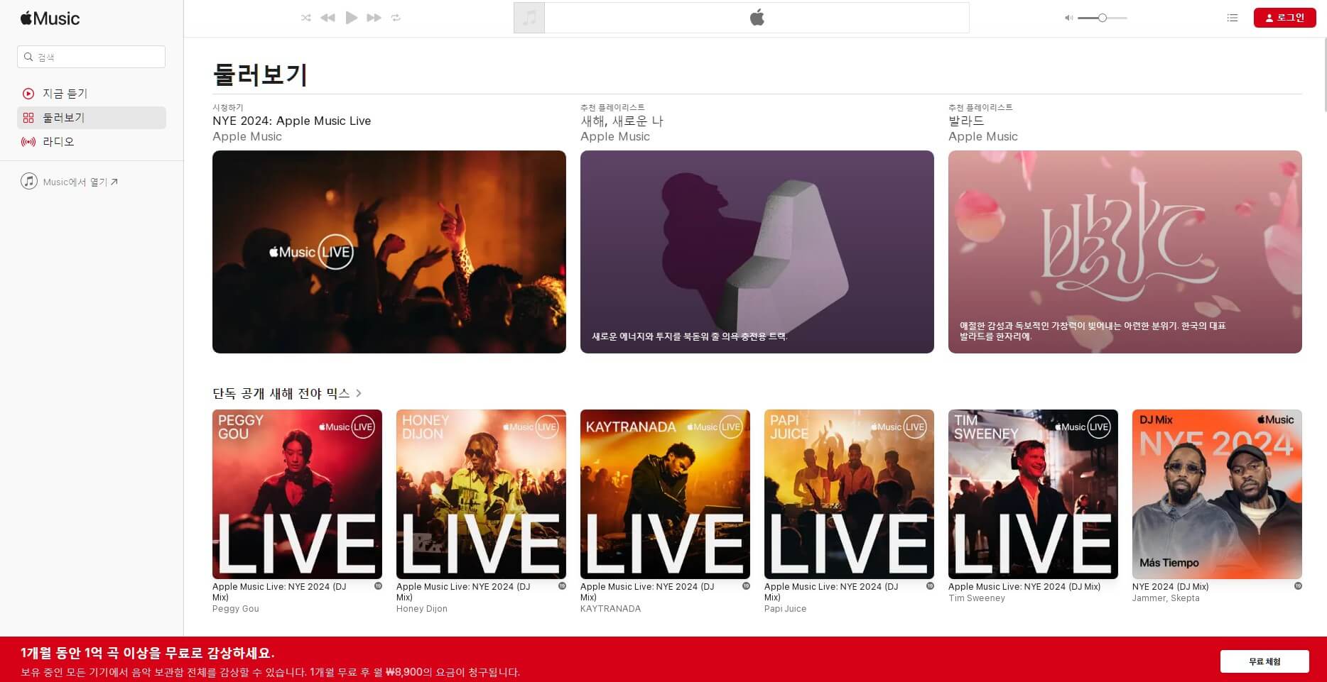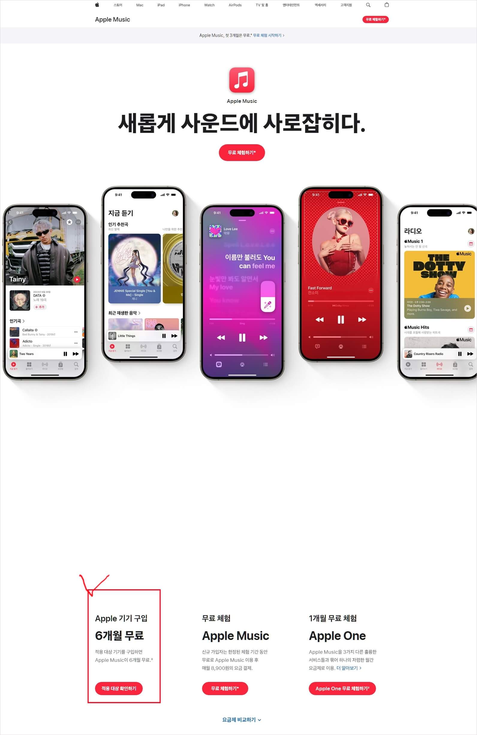 - 애플 뮤직 앱 또는 홈페이지에 접속 시 처음 1개월 무료이용권을 제공합니다. 이를 이용하시면 6개월 무료이용권 사용 후 해치 이후 다시 한번 1개월 이용권을 사용 총 7개월을 무료로 이용하실 수 있습니다.