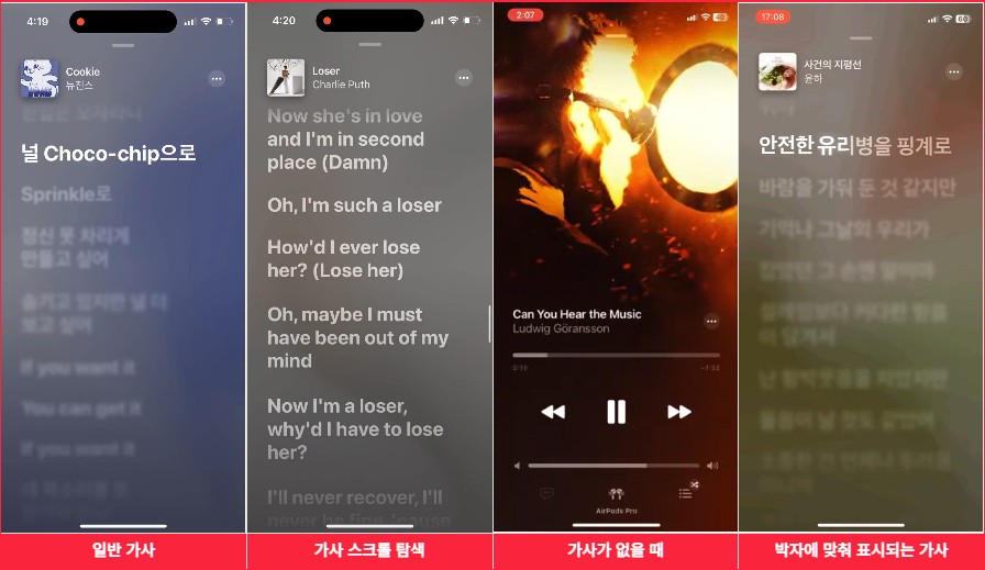 실시간 가사기능이 IOS 16.2부터 노래방 가사처럼 박자에 맞춰 가사가 표시되는 효과가 추가되었으며, 박자에 맞춰 표시되는 가사에서는 코러스 가사만 작게 표시되거나 듀엣곡일 경우 좌우로 나뉘어 가사가 출력됩니다.