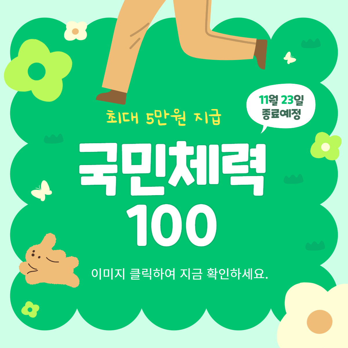 운동만 해도 5만 원을 받을 수 있다는 거 아시나요? 그것도 대한민국 국민 11세 이상이라면 누구나? 23년 11월 23일까지 운동하면서 돈 벌 수 있는 기회 놓치지 마세요.