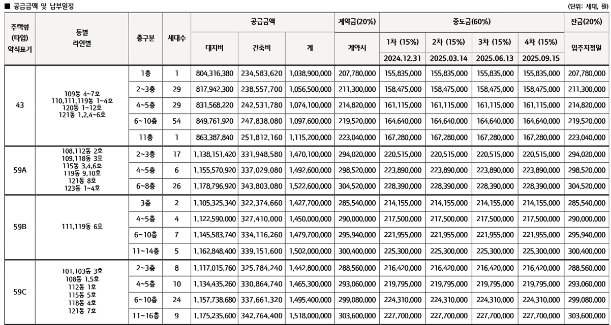 - 59㎡: 14억 2770만 원 ~ 15억 2260만 원