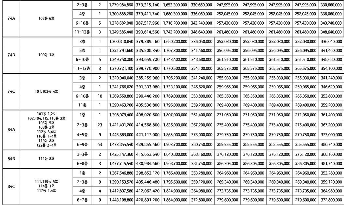 - 74㎡: 16억 5330만 원 ~ 17억 7050만 원