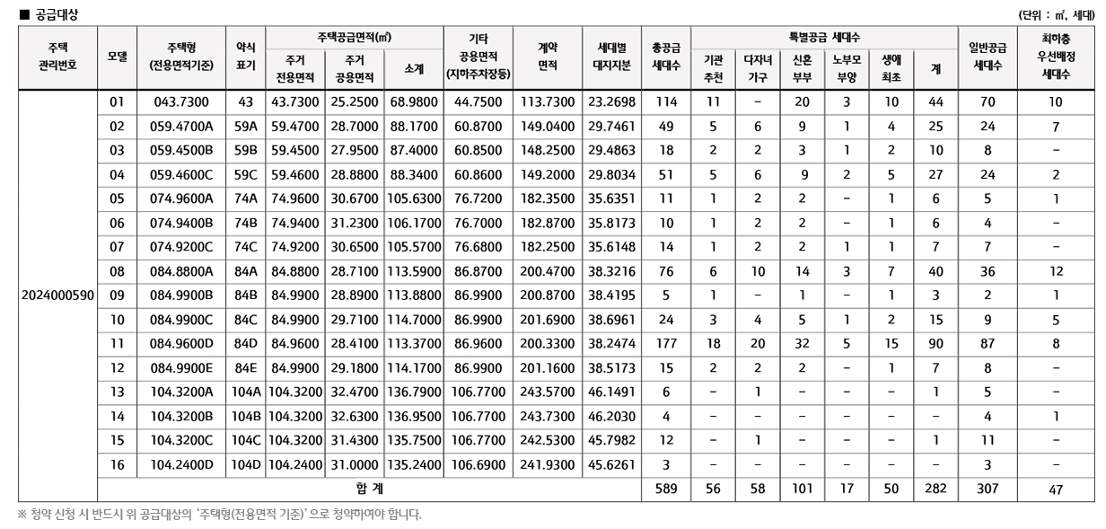 - 전용 면적: 43㎡부터 104㎡까지 다양하게 구성되어 있으며, 소형 가구부터 대형 가족까지 다양한 수요층을 만족시킬 수 있는 면적대로 설계되었습니다.
