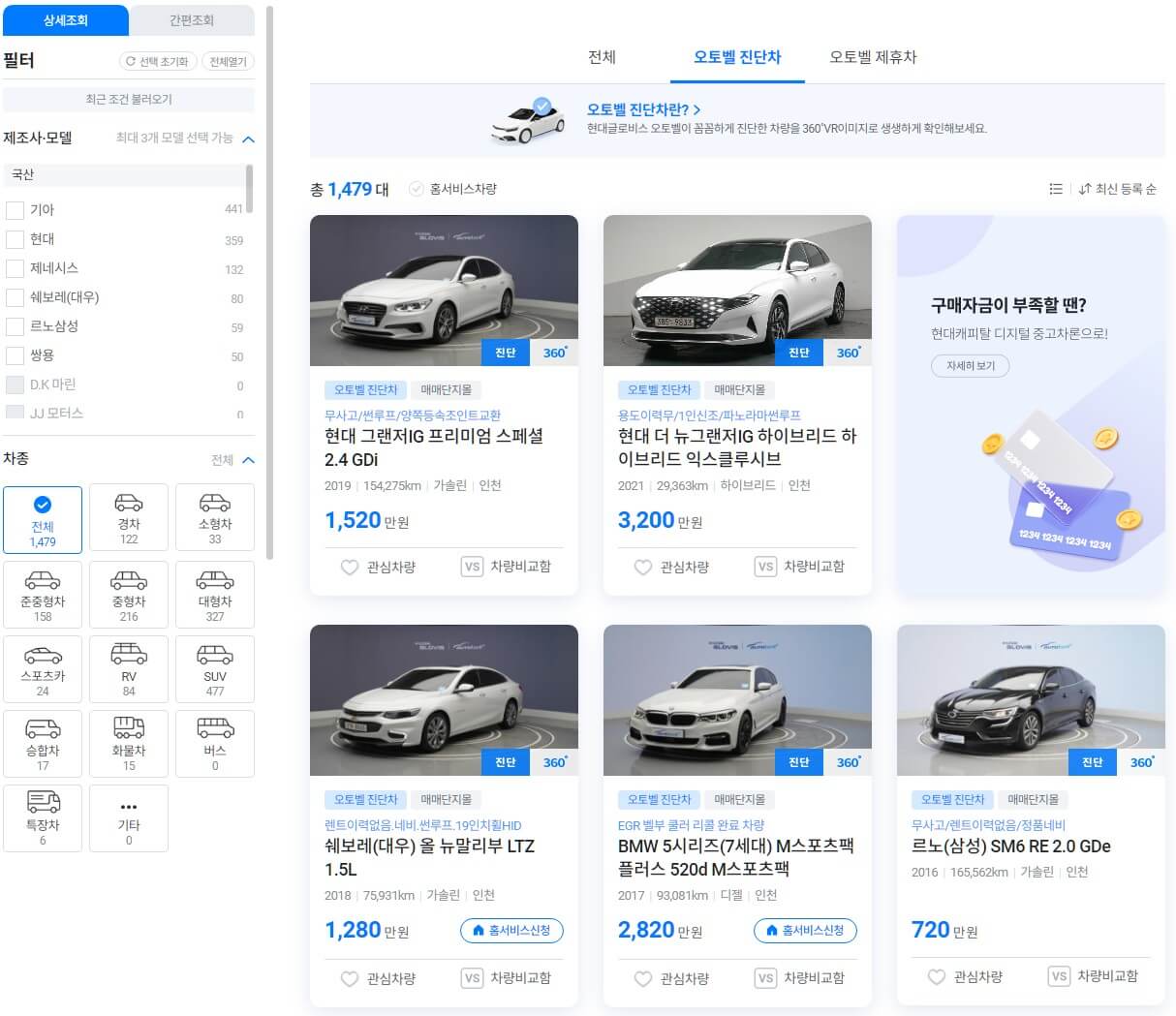 다나와중고차에서는 차종별 중고차 상태를 쉽게 확인할 수 있습니다. 다나 자체적으로 각 차량을 추천해 주는 시스템이 있습니다.