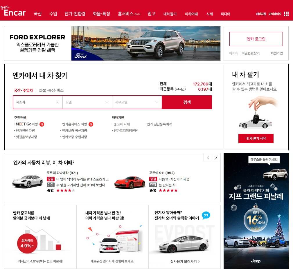 엔카는 SK가 운영하는 중고차 사이트로 국내에서 가장 많은 19만 대 이상의 중고차가 등록돼 있습니다. 대기업 SK에서 이름을 걸고 운영하는 만큼 까다로운 규제과 꼼꼼한 검토로 가장 많은 사용자가 믿고 이용 중입니다.