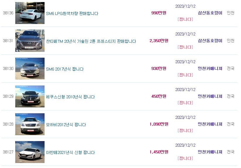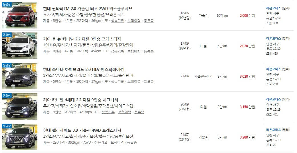 중고차를 보면 터무니없이 가격이 싸거나 비싼 경우를 보셨을 겁니다. 그럴 경우 중고차 허위매물일 확률이 높습니다. 중고차를 사기 전에 중고차 시세를 알고 모르면 큰 차이가 납니다. 아래 링크에서 중고차 시세를 확인한 후 중고차를 구매해서 판매하는 것을 추천합니다.