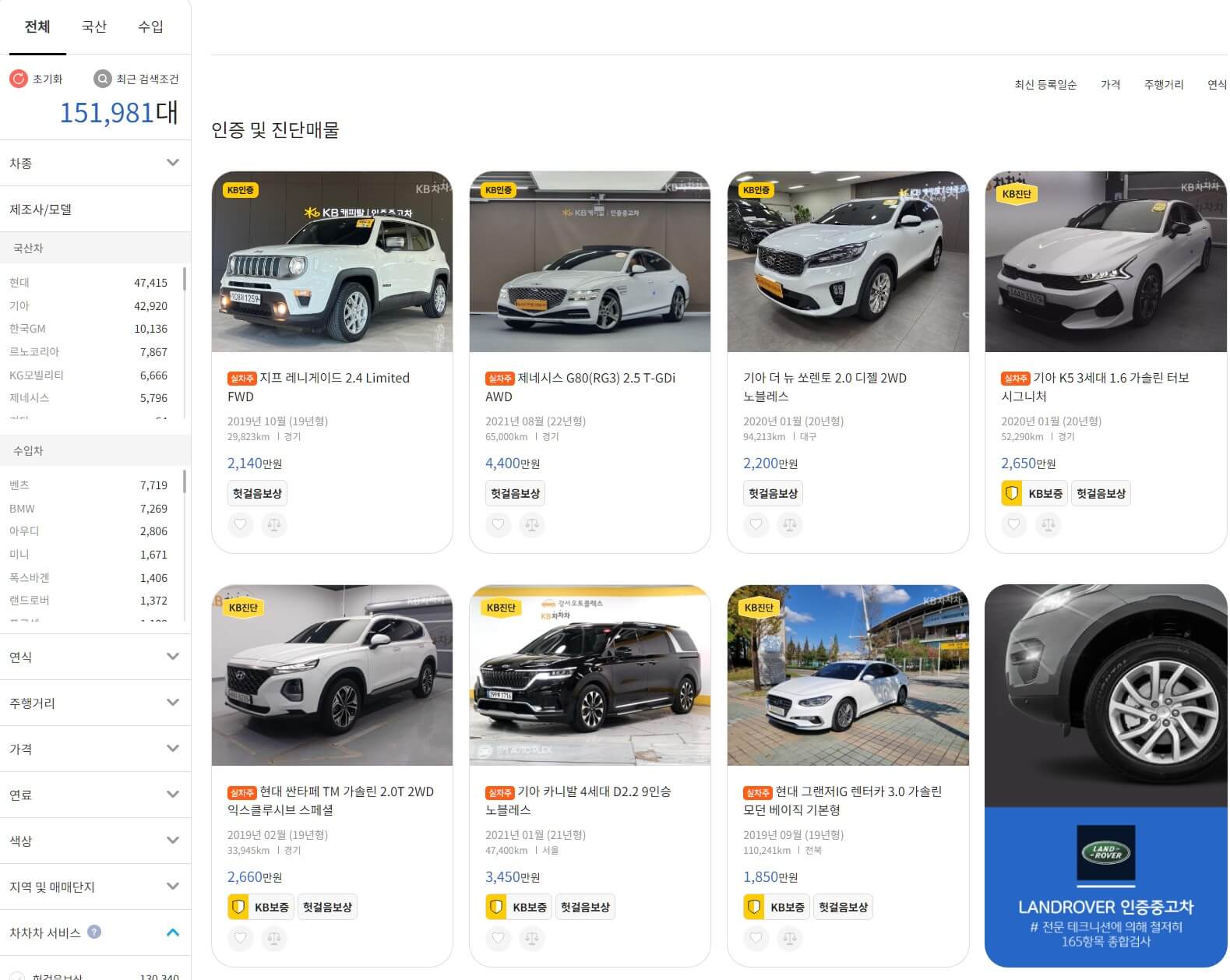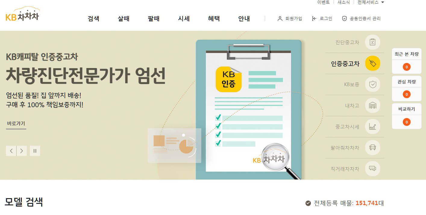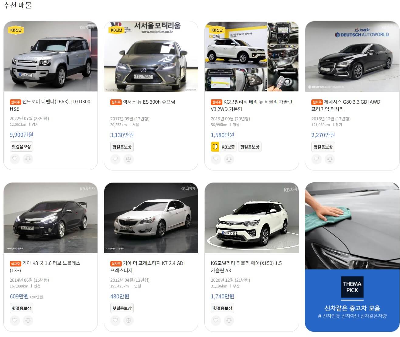 KB차차차에서는 대기업들의 진출이 가능해지며 생긴 중고차 매매사이트로써 무려 16만 대 이상의 차량이 등록되어 있을 정도로 대규모의 크기를 자랑하고 있습니다. 엔카에 비해 연혁이 길지 않음에도 공격적인 광고와 대규모 크기를 내세우며 중고차 매매사이트 시장에 큰 바람을 일으키고 있습니다. KB차차차의 큰 특징으로는 차량 번호만 입력해도 중고차 시세와 사고 정보, 리콜 시장 보험 등 다양한 정보를 확인할 수 있습니다.