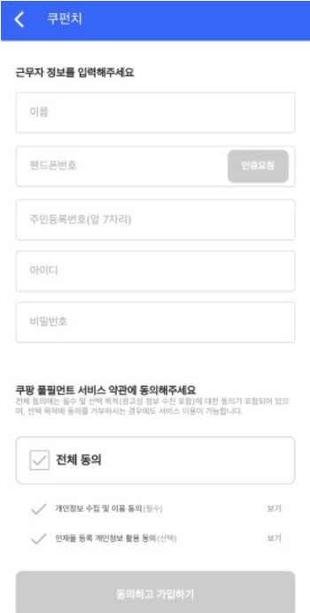 2. 쿠펀치 앱을 실행 후 하단의 일용직 가입하기 버튼을 선택합니다. 이후 개인정보를 입력하시고 서비스약관에 동의합니다.