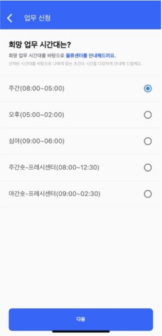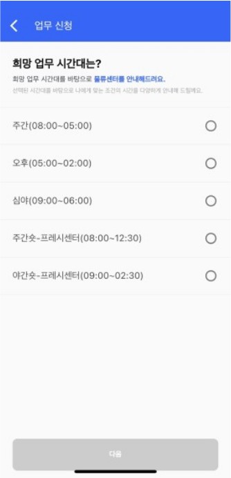 3. 가능한 업무를 선택하고 희망시간대까지 선택하면 완료되며, 추후 문자와 카카오톡을 통해 통지가 온다는 메시지가 뜨면 신청 완료입니다.