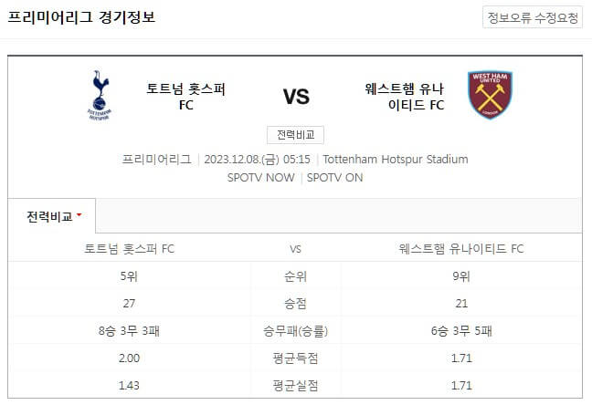 토트넘 대 웨스트햄 중계, 전력분석 12월 8일