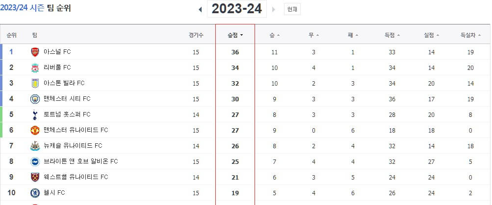 - 토트넘 : 5위 승점 27점 8승 3 무 3패