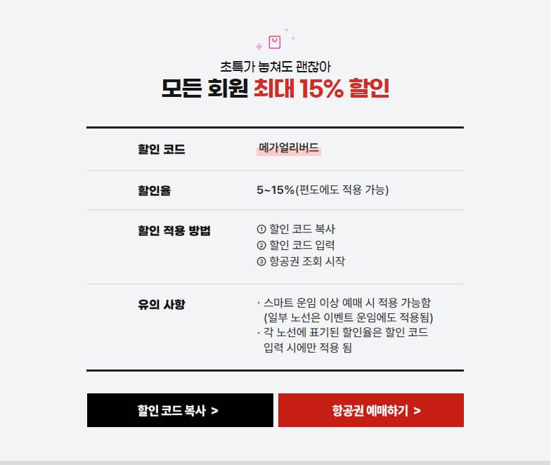 1. 할인 코드 복사를 하지 않으셔도 항공권 검색창에 메가얼리버드를 입력하시면 3월 31일 ~ 10월 26일 사이 날짜에 해당하는 항공권에 할인을 적용받으실 수 있습니다.