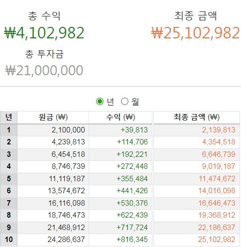 10년동안 보증금 6000만 원을 무이자로 지원해 주는 사업인데요. 그럼 얼마나 이득일까요? 시중의 전세대출상품을 이용 시 최저 3.5%입니다. 1년 6000만 원의 3.5%인 210만 원의 이득을 직접적으로 보며, 10년으로 계산하면 2100만원의 이득입니다. 그럼 위의표를 들어 적금이율이 3.5%로 가정하고 210만 원을 매년 납입하였을 경우 10년 뒤 2천510만 원의 이득을 보게됩니다.