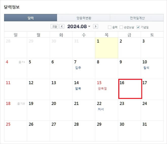 | 8 | 8월 15일 (목) | 광복절 |