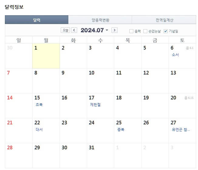 2024년 달력 다운로드, 휴일 정보
