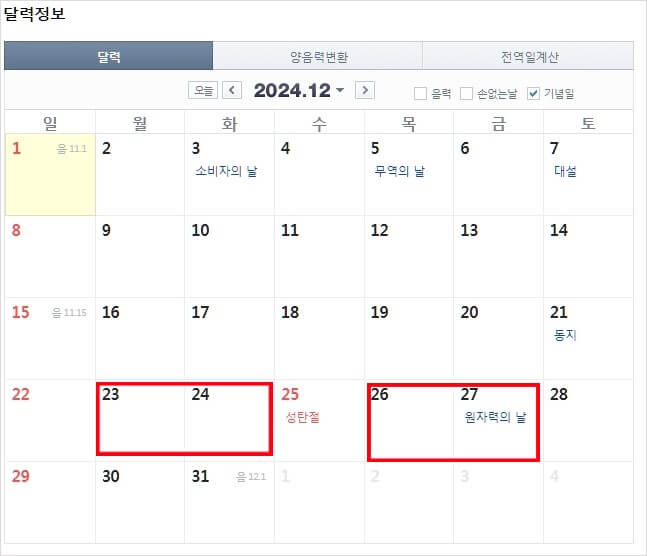 - 12월 : 25일 수 크리스마스 23,24일 월, 화 이틀 연차사용 추천.