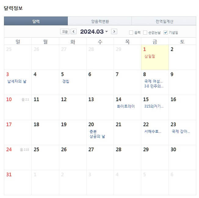 - 3월 : 3월 1일 ~ 3일 금,토,일 3일 연휴