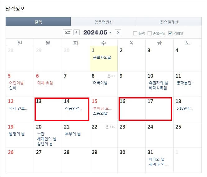 주말과 연휴가 붙어있어 특별히 연차를 내지않아도 연휴확보
