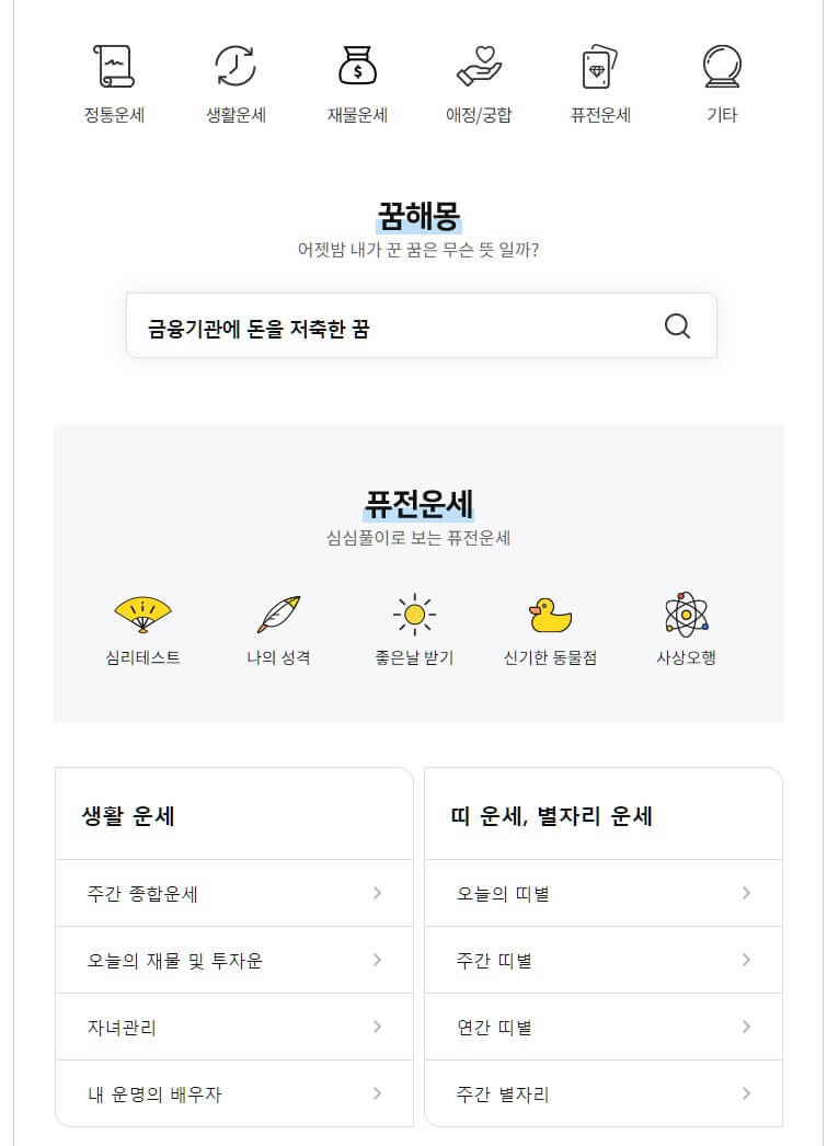 처음 접속화면에서 다소간의 로딩이 있지만 상하로 스크롤되는 메뉴는 인상적이며 카카오톡이 연상되는 구성은 사용하기 편리한 느낌을 준다. 하단 부분의 잦은 광고화면이 나오는 걸 견딜 수 있다면 신년운세, 토정비결, 정통사주, 궁합 등 다양한 콘텐츠가 많아 관심 있으신 분들은 아래에서 확인하시길 바랍니다.