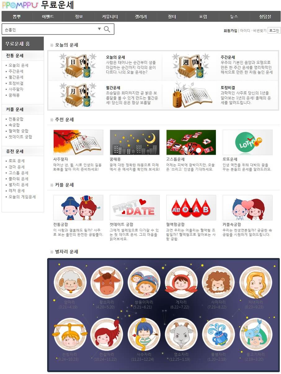 단통법이전 휴대폰 거래하면 뽐뿌라고 외칠 정도로 유명했던 뽐뿌 사이트에서도 운세를 다루고 있습니다. 전통적인 운세 외에도 커플운세, 로또, 경마, 고스톱등 다양한 운세를 볼 수 있습니다. 관심 있으신 분들은 아래에서 확인하시길 바랍니다.