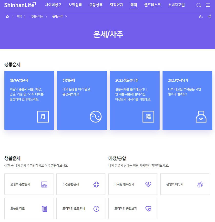 무료 운세 사이트를 찾는 분들에게 매우 인기 있는 신한생명 운세입니다. 2024년 토정비결, 재물운이 새로 업데이트가 되었으며 그 외 정통운세, 생활운세, 애정운세 등 다양한 종류의 토정비결을 매우 디테일하게 제공하고 있으니 관심 있으신 분들은 아래에서 확인하시길 바랍니다.