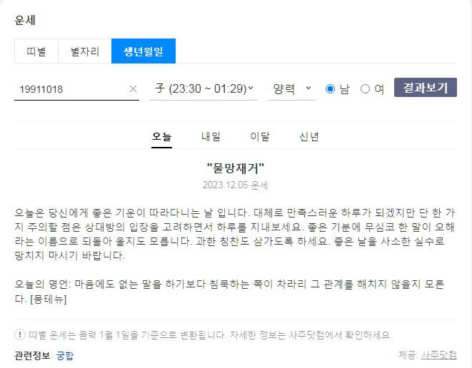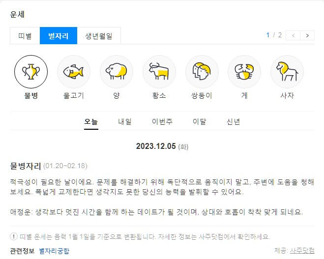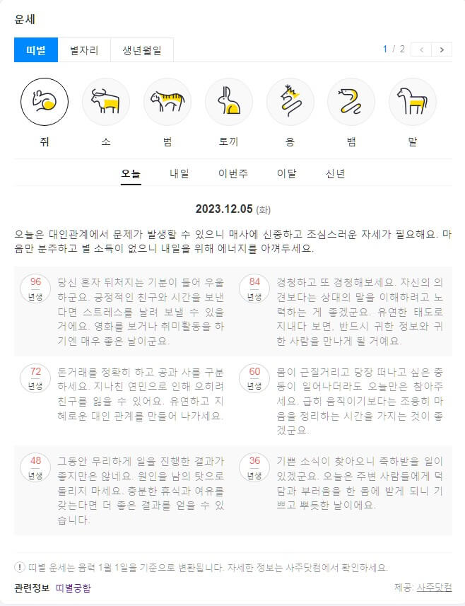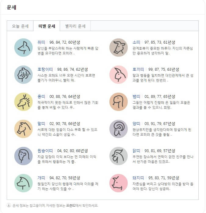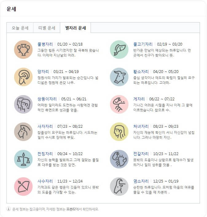 다음이 하는데 네이버가 빠질 수 없겠죠. 대한민국 대표 포털 사이트 네이버에서도 운영 중이며 오늘의 운세, 띠별 운세, 별자리 운세를 운영 중입니다. 관심 있으신 분들은 아래에서 확인하시길 바랍니다.