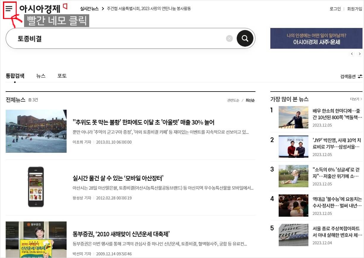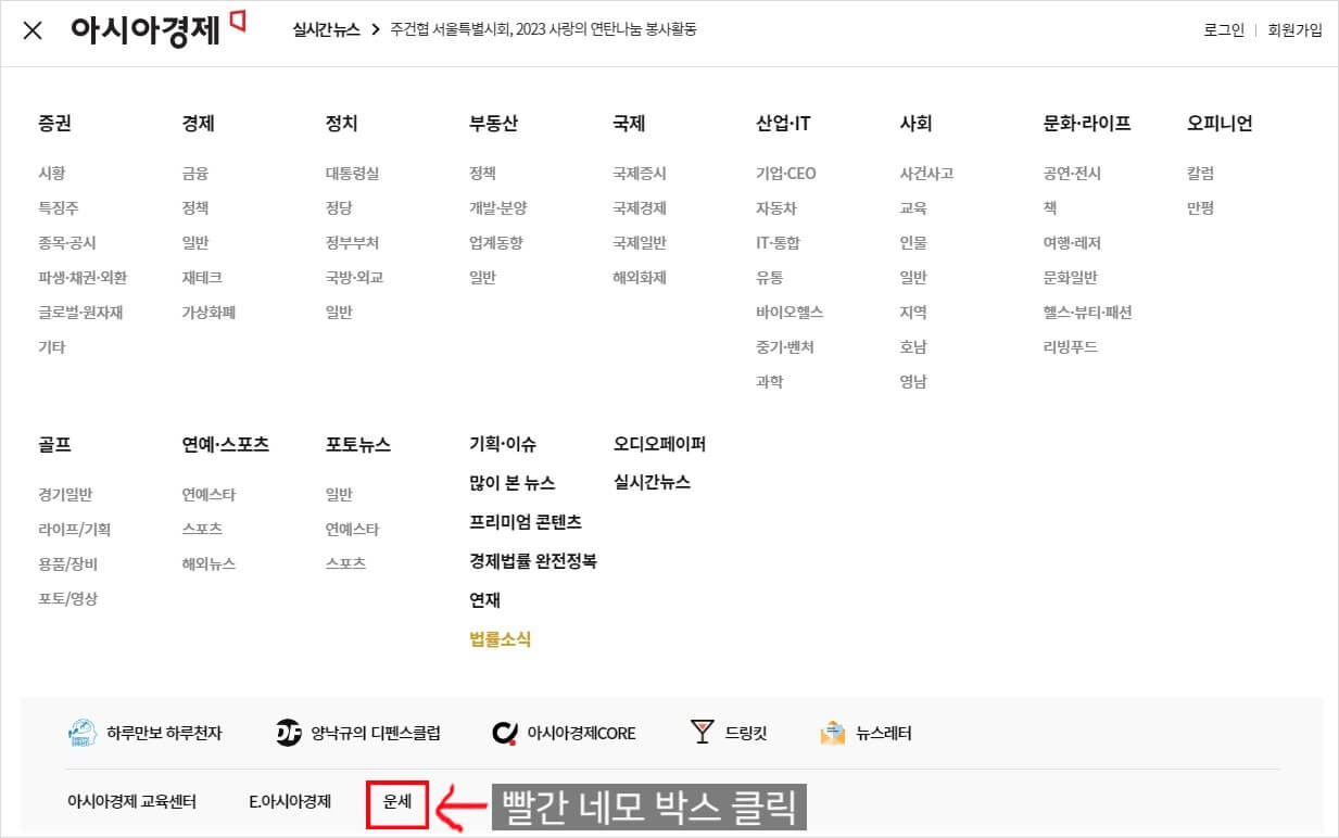 경제신문 아시아경제에서도 운세 사이트를 운영 중입니다. 다만 아시아경제 홈페이지로 접속하시면 운세사이트로 접속방법을 찾기 어려우신데요. 오른쪽 최상단의 메뉴를 클릭하셔서 전체 항목을 오픈한 다음 하단 부분의 작은 운세 글씨를 클릭하셔야 운세 사이트로 접속하실 수 있습니다. 자세한 방법은 위의 이미지대로 클릭하시면 되고 번거롭게 따라지 마시고 아래의 링크버튼을 클릭하시면 바로 접속하실 수 있으니 관심 있으신 분들은 아래에서 확인하시길 바랍니다.