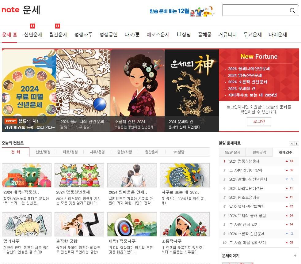 추억의 네이트온으로 유명했던 네이트에서도 운세 사이트를 서비스 중입니다. 로그인을 하신다면 2024년의 다양한 신년운세를 볼 수 있으며 타로, 점성, 궁합 등은 물론 핫이슈등 다양한 사연을 접목한 서비스를 운영하고 있으니 관심 있으신 분들은 아래에서 확인하시길 바랍니다.