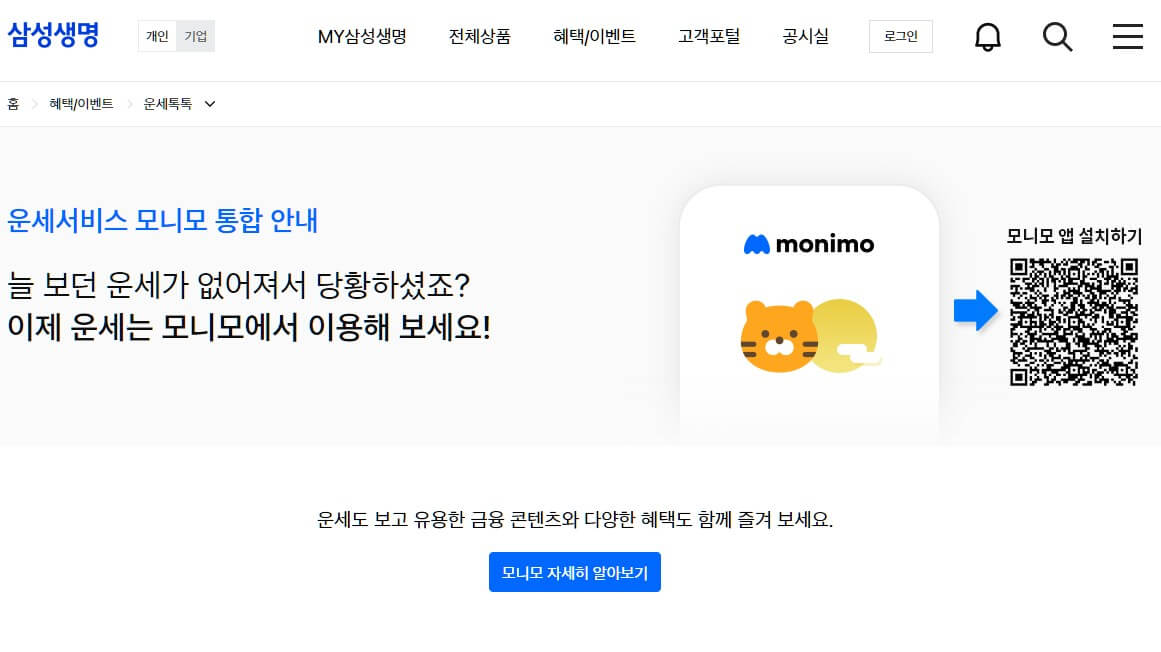 삼성생명 홈페이지에서 운영 중이던 운세서비스를 자체 앱 모니모를 만들면서 pc버전에서는 삭제 안드로이드와 애플기반의 앱에서만 이용할 수 있는 모니모 운세 서비스입니다. pc에서는 이용할 수 없으니 앱에 관심 있으신 분들은 아래에서 확인하시길 바랍니다.