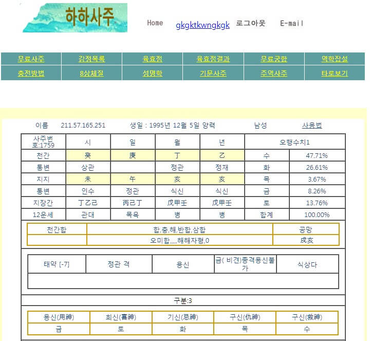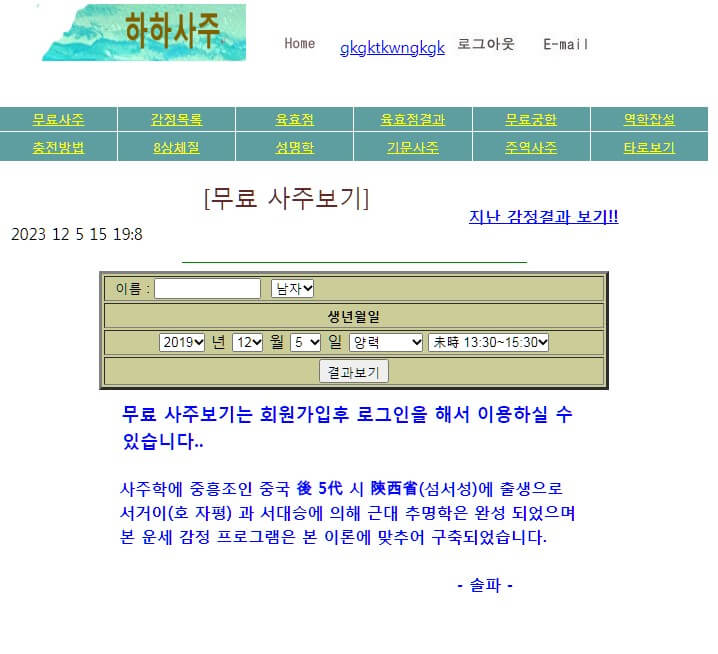 전문적인 다양한 사주메뉴가 있는 하하사주입니다. 로그인 시 일정금액을 요구하지면 지불하지 않고도 이용가능하니 회원가입 시 입금하실 생각이 없으신 분들은 안 하셔도 다양한 메뉴를 이용하실 수 있습니다. 관심 있으신 분들은 아래에서 확인하시길 바랍니다.