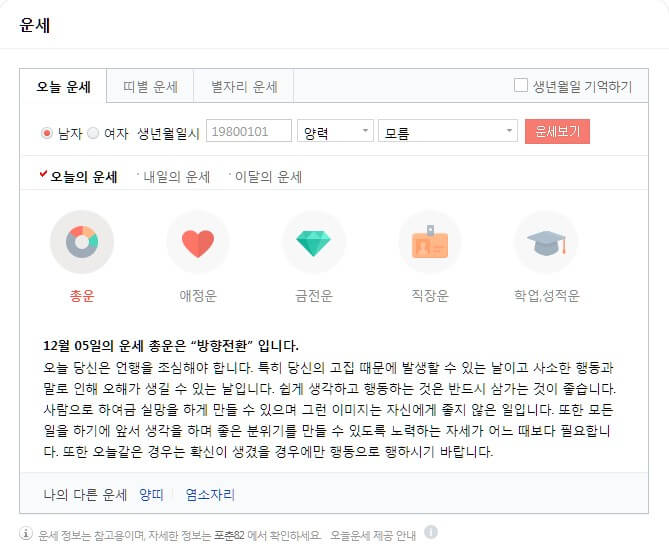 대한민국의 대표적인 포털 사이트 다음에서도 운세 서비스를 운영 중입니다. 2024년 신세운세 항목이 추가되었고 띠, 별자리, 생년월일에 따른 운세가 확인가능합니다. 관심 있으신 분들은 아래에서 확인하시길 바랍니다.